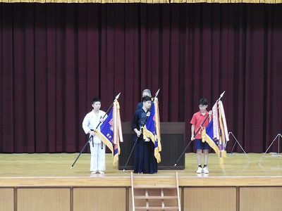 5月20日(火)7校時、速見記念館にて西彼杵郡中学校総合体育大会の選手壮行会が行われました。まず、一般生徒が入場整列した後、選手たちが各部ごとに入場し、壇上で紹介されました。その後昨年度の大会で空手道部、剣道部、水泳同好会が獲得した優勝旗が校長先生から授与され、ついで青雲中学校旗が代表のテニス部主将に授与されました。次に、選手代表として、サッカー部主将の選手宣誓があり、校長先生の訓示、最後に応援生徒代表より挨拶がなされました。本校の代表として、これまでの練習の成果をしっかり発揮して欲しいと思います。
