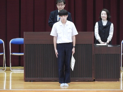 5月30日(金)午後、速見記念館にて、先週行われた中総体の結果報告会が行われました。中学生徒の見守る中最初に、見事優勝した柔道部、空手道部、剣道部の代表から優勝旗が披露され、さらに活躍した選手個人も合わせて表彰伝達が行われました。次に、各部の代表より試合の結果が報告され、教頭先生の訓示で会は終了しました。大会に参加した選手の皆さん、練習の成果を十分発揮できたことと思います。この経験を、ぜひ次のステップに活かしましょう。
