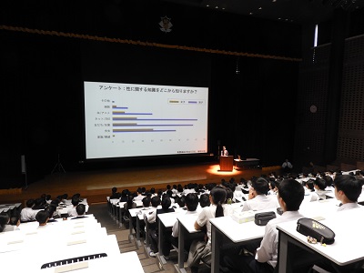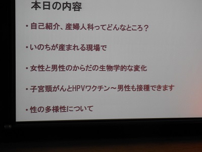 11月6日(木)15:10より階段教室にて、高校2年生を対象にした性教育講座が開かれました。講師の先生として、本校27回生で、産婦人科クリニックを開業されておられる淵先生に来校していただき、「いのちが生まれる現場で」という題目で、様々に大切なお話をしていただきました。