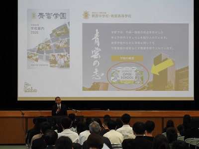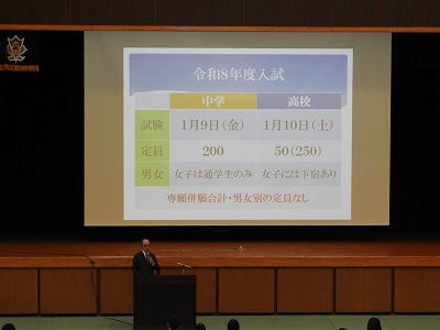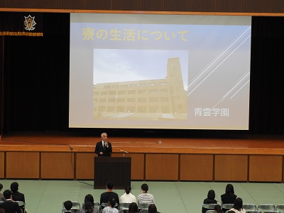 13:00からの全体会は、校長先生による青雲学園の紹介に始まり、寮館長の寮の説明、最後に総務部長が入学試験の説明を行いました。お忙しい中、多くの方にご参加いただき、ありがとうございました。