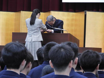 第49回生の卒業式がいよいよ明日2月22日(日)となりましたが、本日21日はその予行が行われました。予行の後、49回生からの卒業記念品贈呈式が行われ、記念樹および教育機器をいただきました。その後、高体連、高文連、私学協会からの表彰伝達式となり、3名が表彰されました。